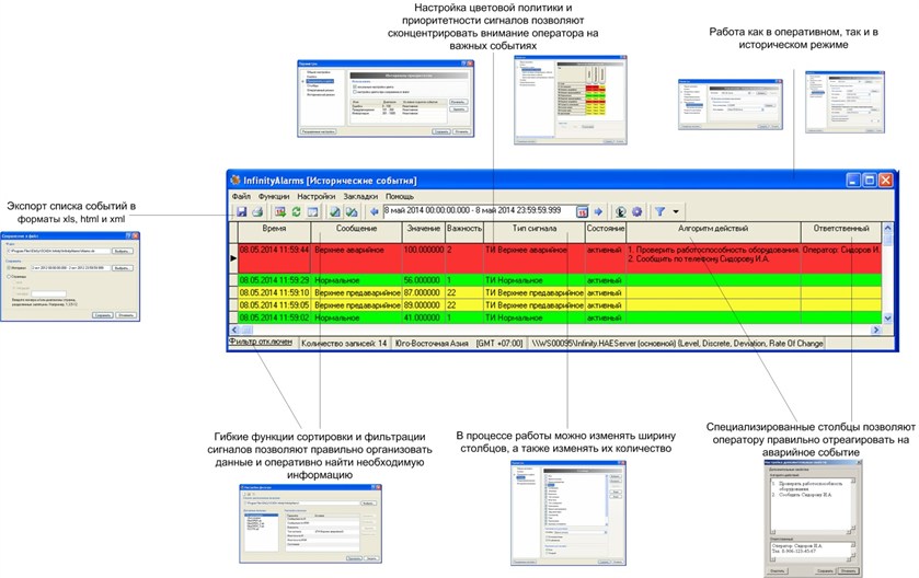 Возможность экспорта списка событий в форматы xls, html и xml позволяет анализировать историю возникновения аварий в удобном виде. А использование ActiveX технологии позволяет интегрировать оповещения SCADA Infinity в сторонние приложения.